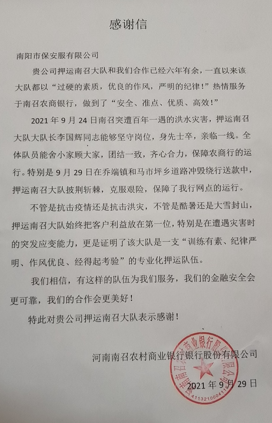 9月29日,河南南召农村商业银行股份有限公司专门给yx06永兴彩票集团发来一封感谢信,称“贵公司南召押运大队和我们合作已经六年有余,一直以来该大队都以‘过硬的素质,优良的作风,严明的纪律’热情服务于南召农商银行,做到了安全、准点、优质、高效。特别在疫情防控和抗击洪灾的斗争中,所表现出的团结一致,齐心合力,不畏艰险,勇猛善战,更加证明了是一支“训练有素,纪律严明,作风优良,经得起考验”的专业化押运队伍。”