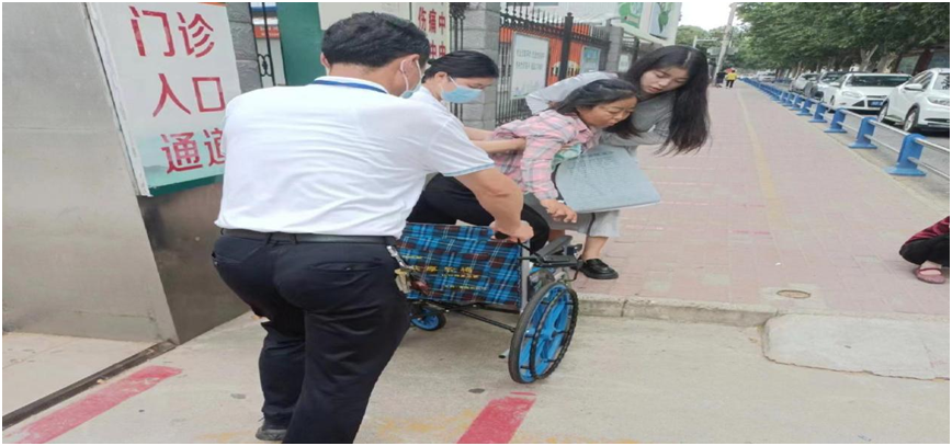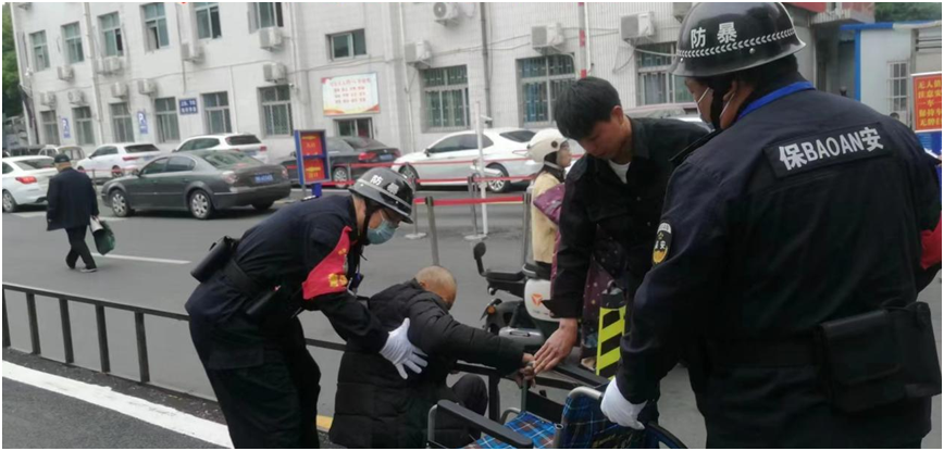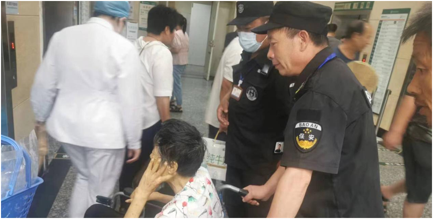 6月1日9时,一名老太太骑着电动三轮车将老伴送到市中心医院门诊楼门口,想让他下来,但由于腿脚不方便,下车困难。市保安公司驻东二门保安班长和正在此处巡逻的王风和队长见此情况,迅速跑上前去帮忙搀扶就医。