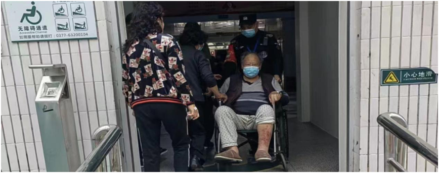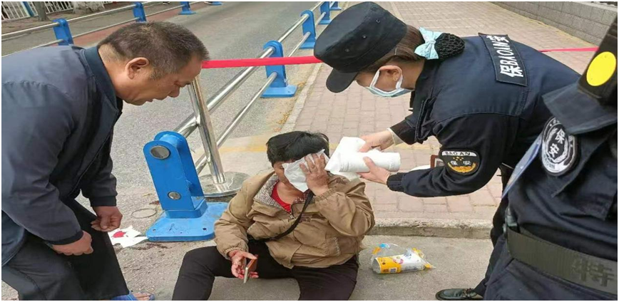 7月13曰15时20分,正下着大雨,南阳市中心医院巡逻队员张磊、武向阳冒雨巡逻至一号楼职工通道与小公园中间,忽然发现前面地上坐着一个名女子,嘴里往外流着血,傍边也没有家属陪伴,情况十分危机。张磊迅速用对讲机将情况报告给队长王风和,王队长立即通知了一号楼班长薛显生。薛班长及时借来轮椅,同张磊、武向阳和赶来帮忙的巡逻队长康辉以及去借运输工具归来的女子家属一起,冒雨将女子快速送往一号楼二十二楼病区进行抢救。