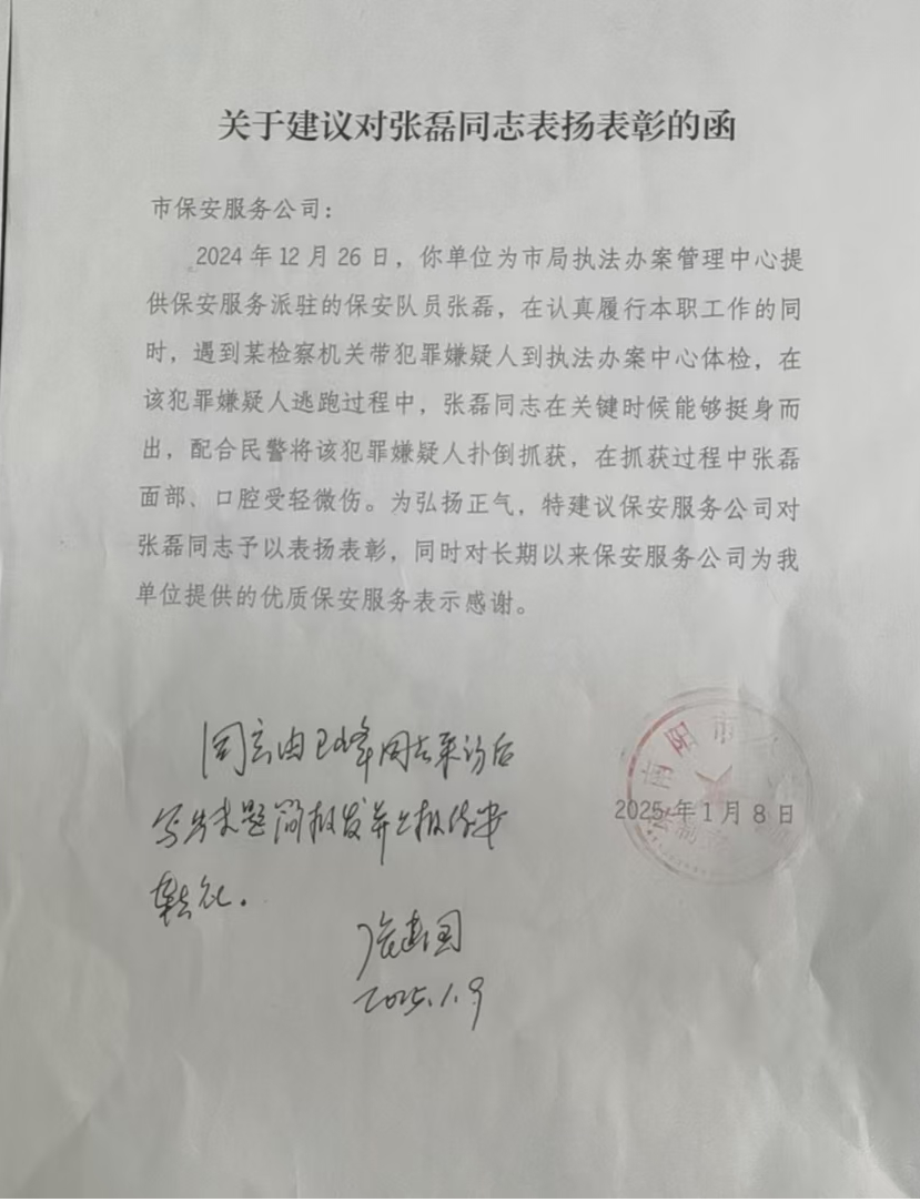 南阳网讯(通讯员 王峰)2025年1月8日,yx06永兴彩票集团接到一封来自市公安局法制支队《关于建议对张磊同志表扬表彰的函》(以下简称(函)。《函》中说,“张磊同志在关键时候能够挺身而出,配合民警将该犯罪嫌疑人扑倒抓获......”,并表示“为弘扬正气,特建议保安服务公司对张磊同志予以表扬表彰,同时对长期以来保安服务公司为我单位提供的优质保安服务表示感谢。”