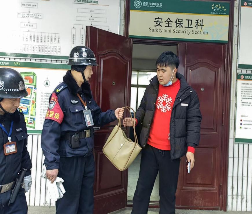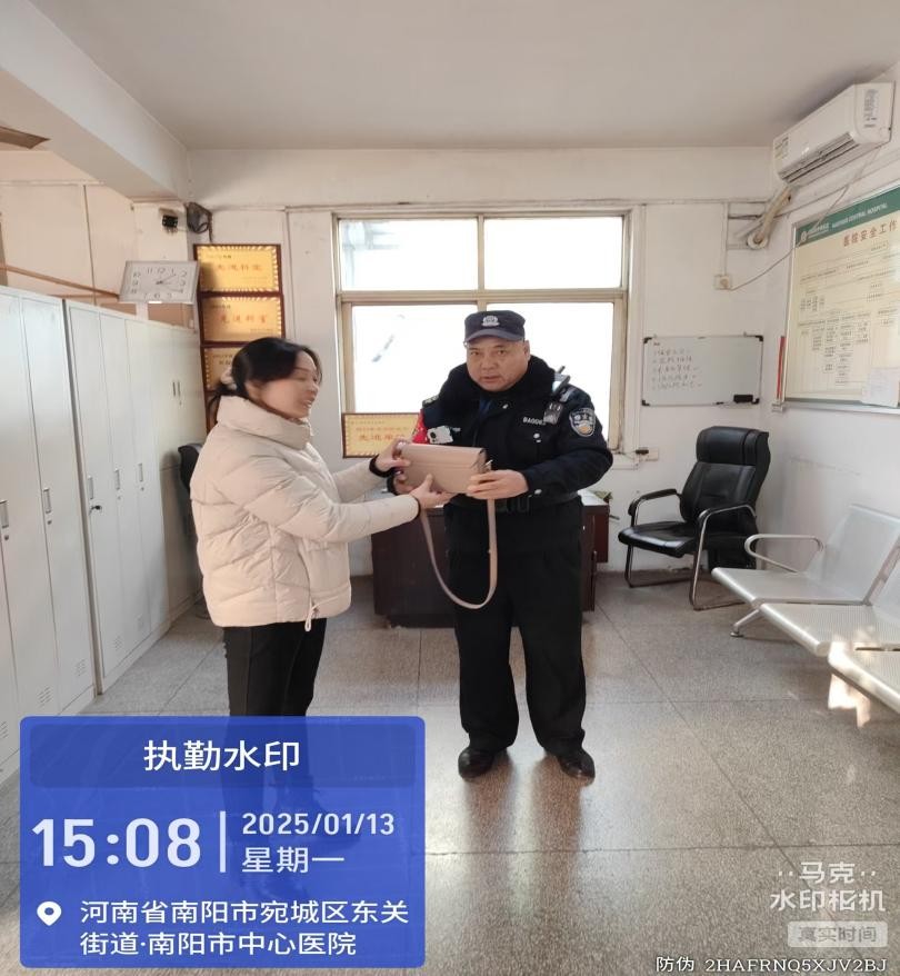 1月18日11时许,南阳市保安公司驻市中心医院保安队员张勇和陈小雷巡逻到一楼大厅时发现一个女式提包,包里有很重要的物品和住院的资料和单据等。经过在大厅内外询问和寻找,终于找到失主。经核实确无误,归还失主。