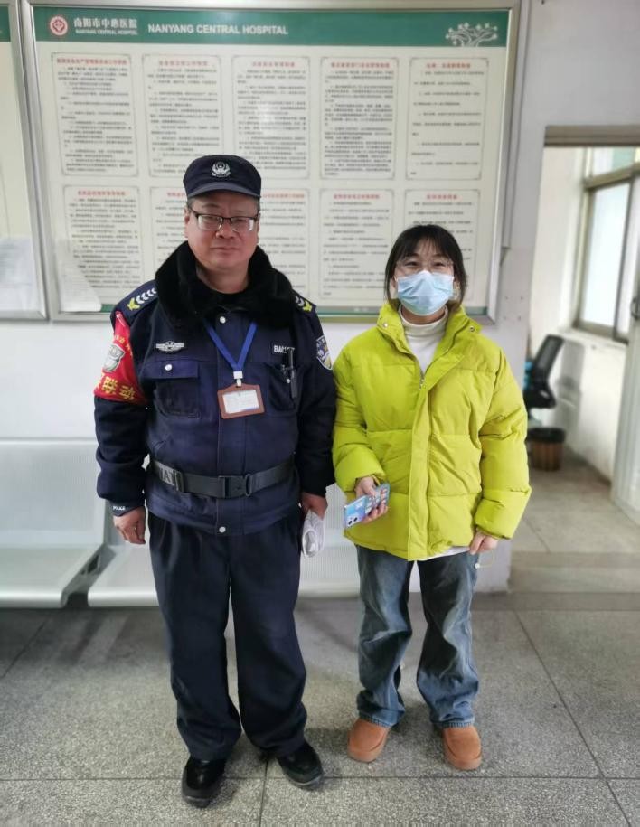 1月 13日12点许,南阳市保安公司驻市中心医院保安员张宏业在该院东一门执勤时捡到一个手机。为尽快找到失主,他通过系统查找并关注失主来电,十几分钟后,一个女孩急促打来电话。张宏业通过电话沟通核实无误后,让失主取回,失主接过失而复得的手机感激万分。