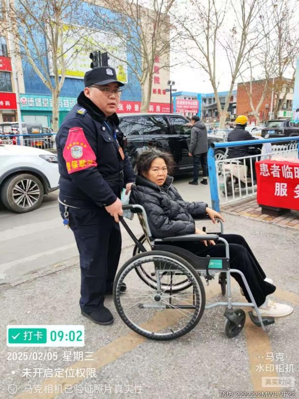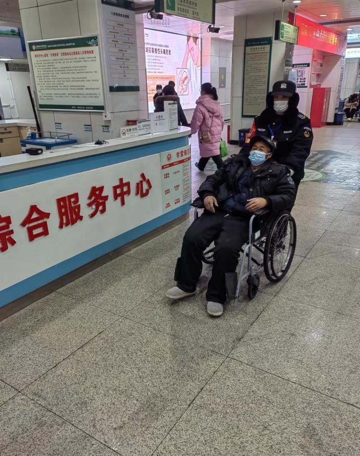 2月5日9时许,在南阳市中心医院门诊楼前,南阳市保安公司驻勤值班队长王风和和保安员于伟、王玉清得知患者因病行动不便急需帮助时,他们推来轮椅,大家一起把患者搀扶到轮椅上,然后送往相关科室就诊,患者及家人十分感动。