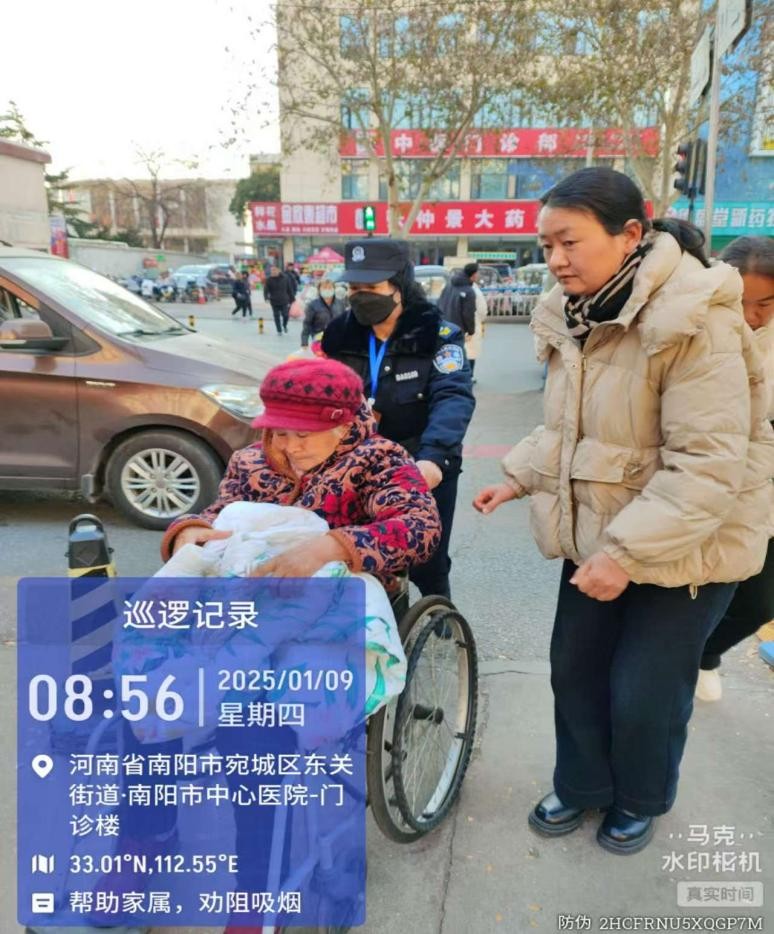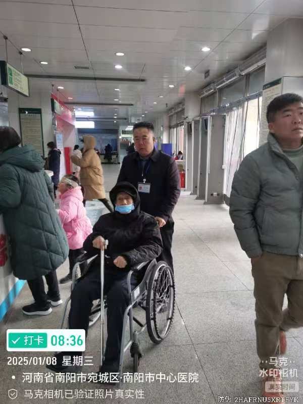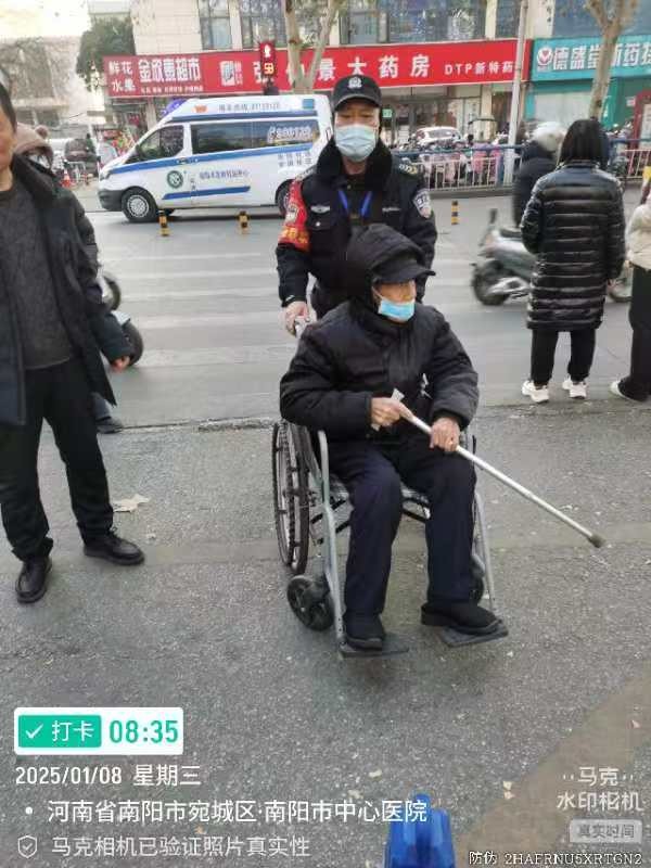 1月8日8点30分,南阳市保安公司驻市中心医院值班队长邢九明在门诊楼前发现一位老人患者行动不便,即和保安班长王建国一道用轮椅将患者推送到门诊就医。