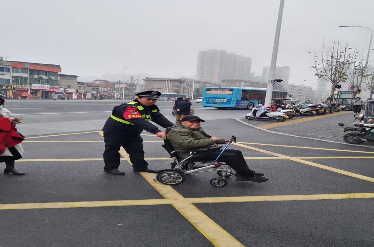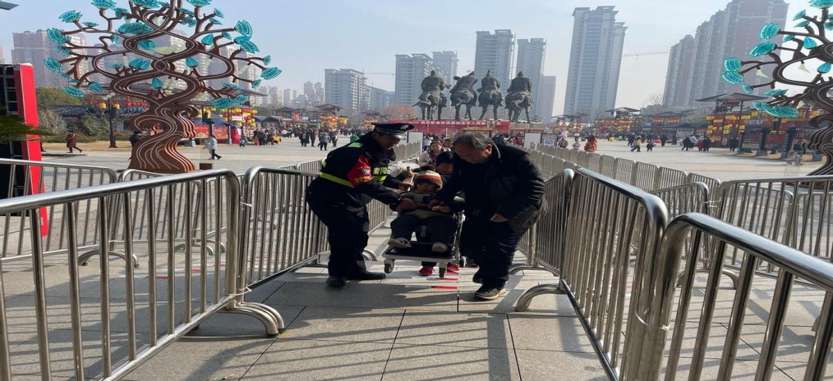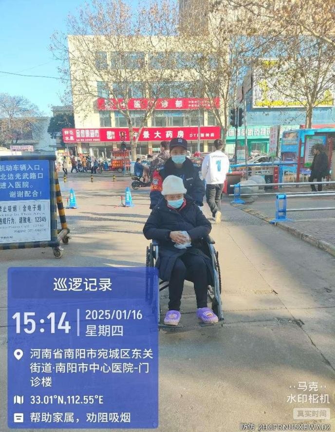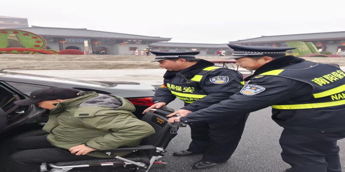 2月2日10:30,南阳市保安公司驻医圣祠文化园北广场保安队员张兵,主动帮助为行动不便的老年游客提供方便。