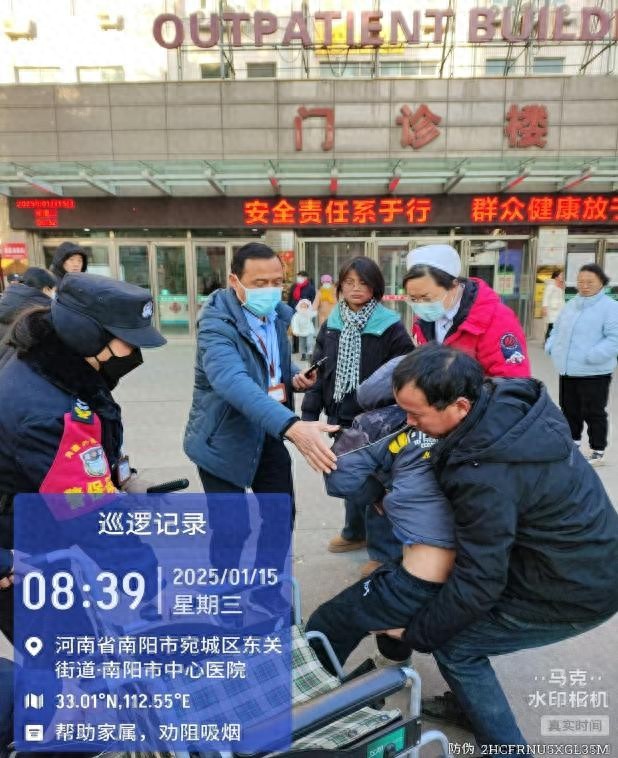 1月15日 8点35分,南阳市保安公司驻市中心医院保安队长王风和正常院区例行巡查任务,发现一家长抱着小孩求救到门诊楼急诊,王队长喊来应急队员王建国、付保阁及时将患者搀扶到轮椅上,直接送往脊柱外科就诊。
