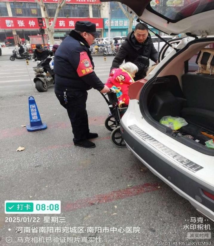 1月23日 8点半左右,在南阳市中心医院门诊楼前,南阳市保安公司驻勤队员付保阁和王建国得知车上有一位前来就诊的老人行动不便,他们一起将患者搀扶到轮椅上, 送往门诊相关科室就诊。患者及家人十分感动,