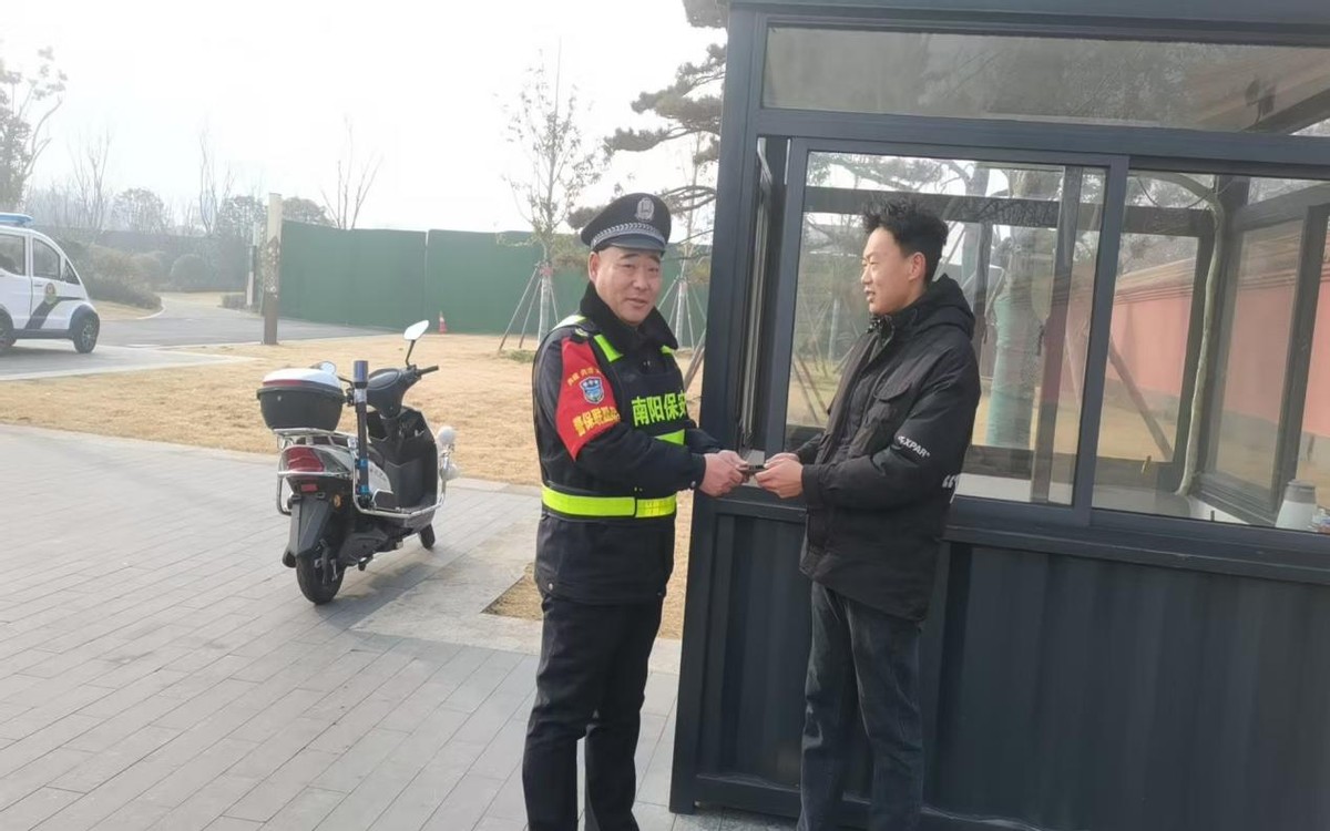 1月28日14时28分,南阳市保安公司驻南阳医圣祠文化园执勤队员华小伟在西门口拾到一串钥匙,立即送至客服中心,客服中心联系到失主并交还。